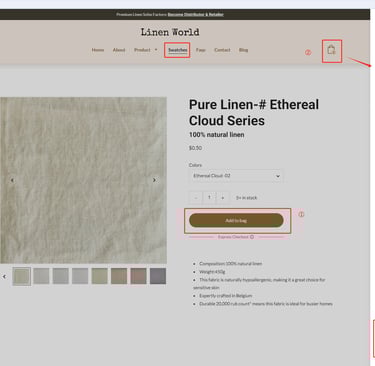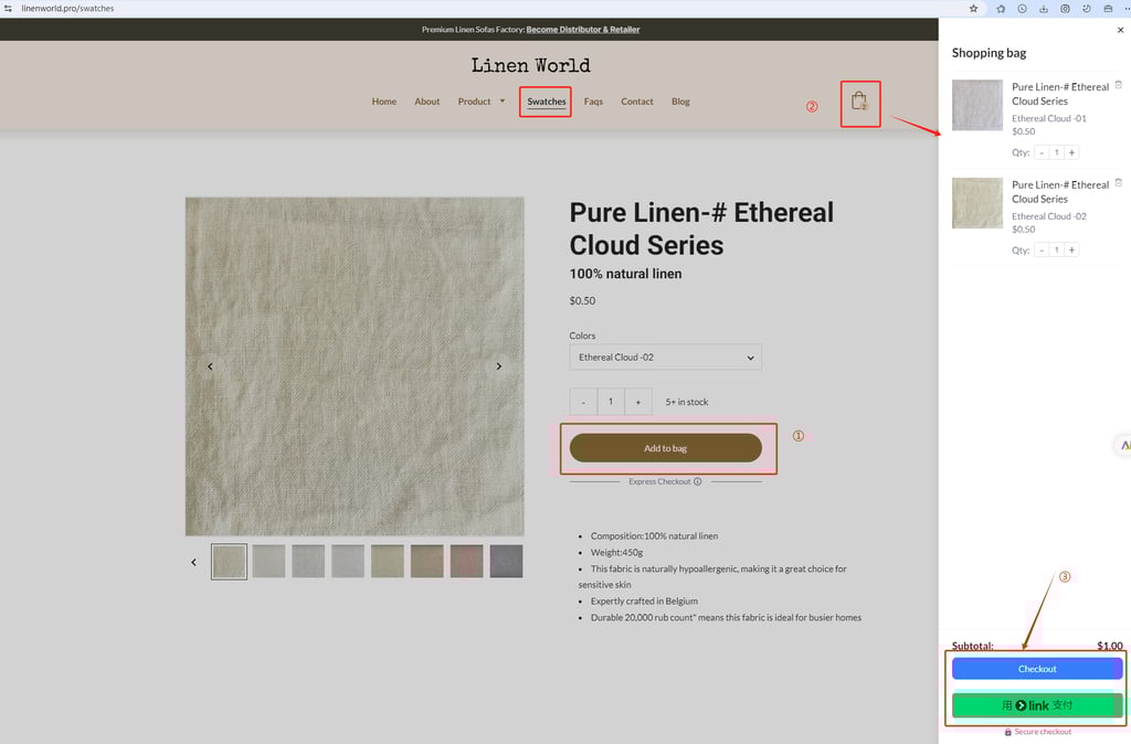 Click the “Add to bag” button (marked as ① in the image) to add the selected fabric swatch to your shopping bag. You can repeat this step to add multiple swatches.
